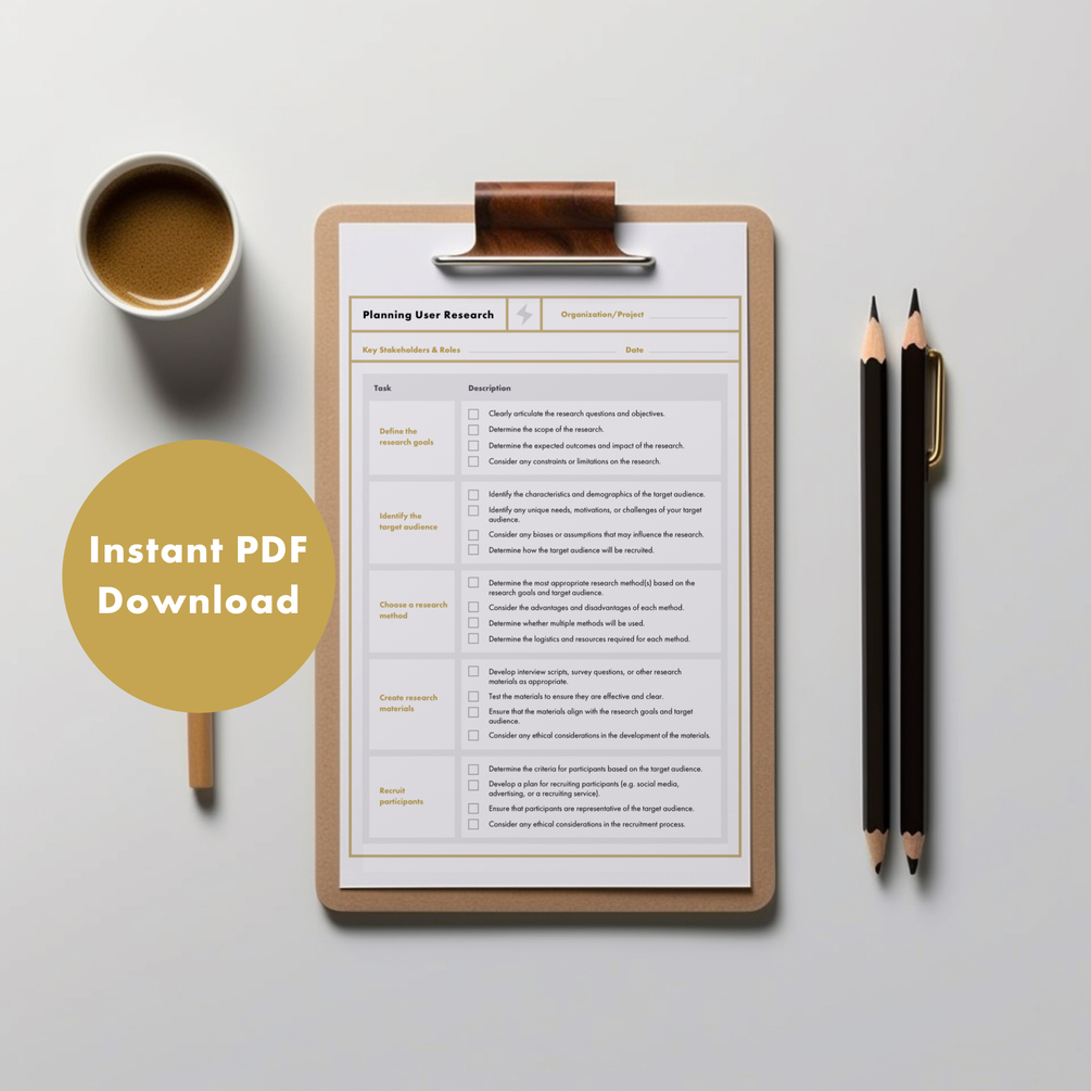 ⭐ At this store, my focus is to help you understand your users' needs, motivations, and preferences in order to create exceptional experiences. That's why I have curated a detailed and practical checklist that covers all the essential steps involved in planning user research.